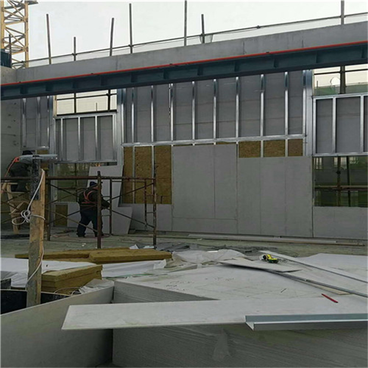 泄爆材料規(guī)格為1220mm*2440mm*9.0mm泄爆板,龍骨規(guī)格為100mm*40mm*0.6mmC型鋼,增設100mm*50mm*3mm方管為加強龍骨,龍骨與墻面、立柱采M10膨脹螺絲固定。巖棉密度45kg/m3。