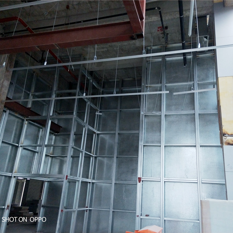 4.安裝橫向卡擋龍骨:根據(jù)設(shè)計要求,隔墻高度大于3m時應(yīng)加橫向卡檔龍骨,采向抽心鉚釘或螺栓固定。
